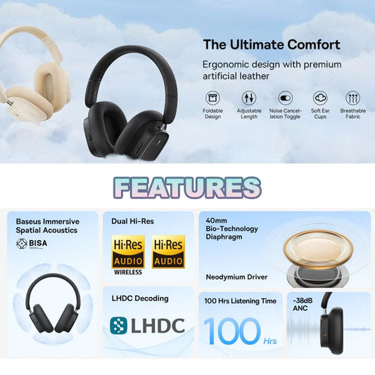 Baseus Bowie H1i Wireless Headphones, Wired or Wireless, ANC, App Configuration